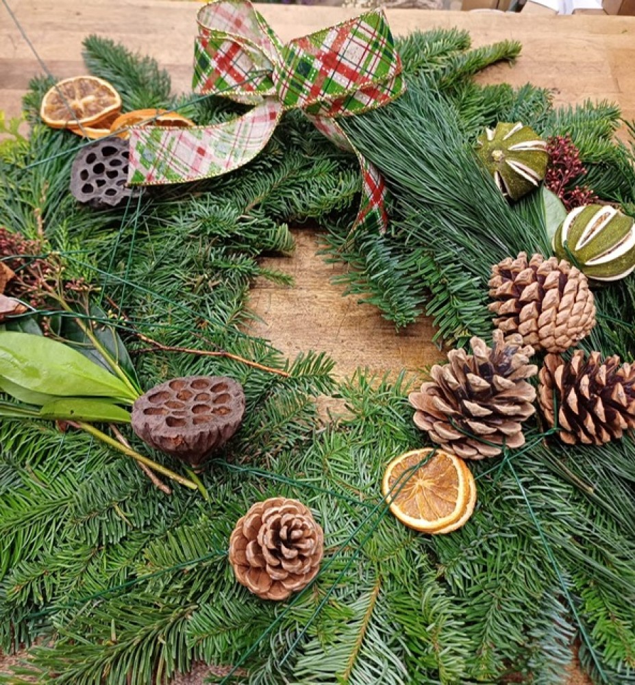 Bag containing a spruce wreath base and cut foliage, wire, cones and fruit and a bow for you to put together your own wreath for your door or table arrangement. Instructions on how to design your wreath but open to artistic license. A lovely gift for the creative or have a few friends around for your own wreath decorating party!